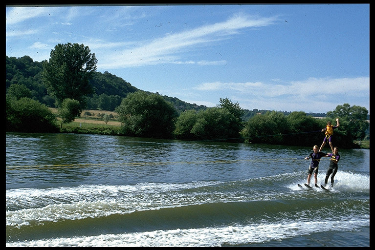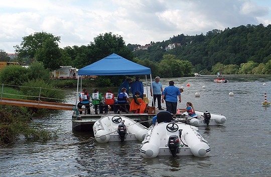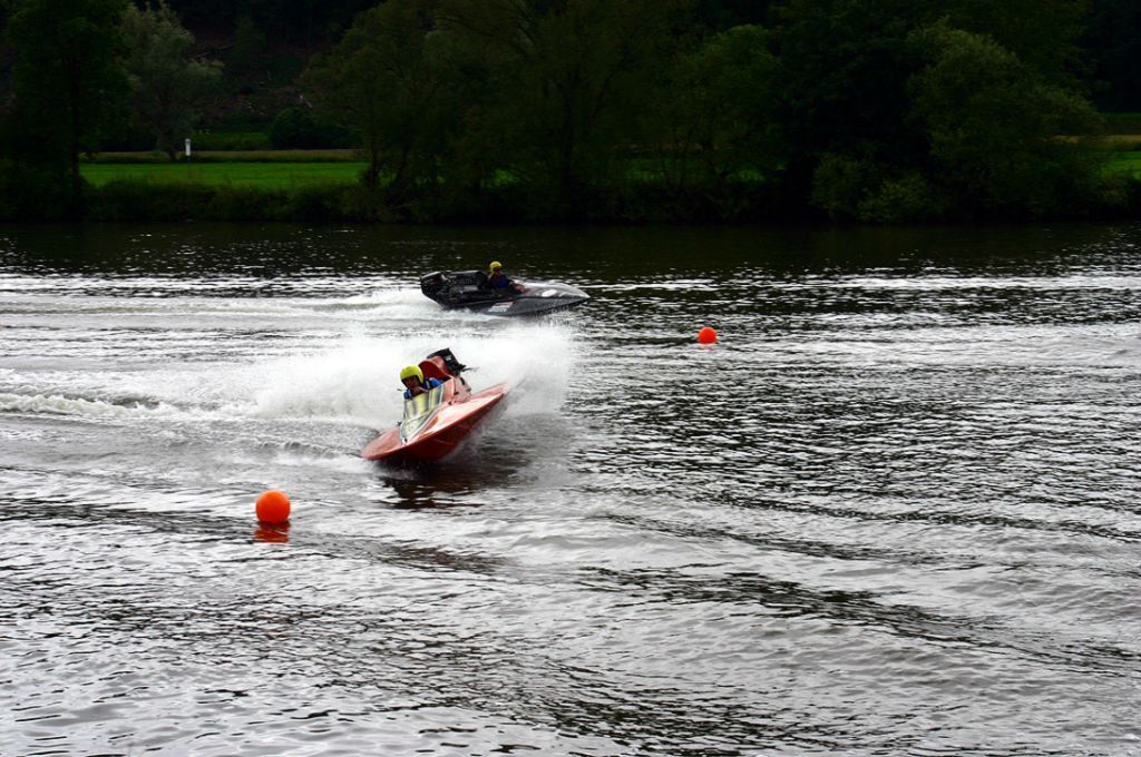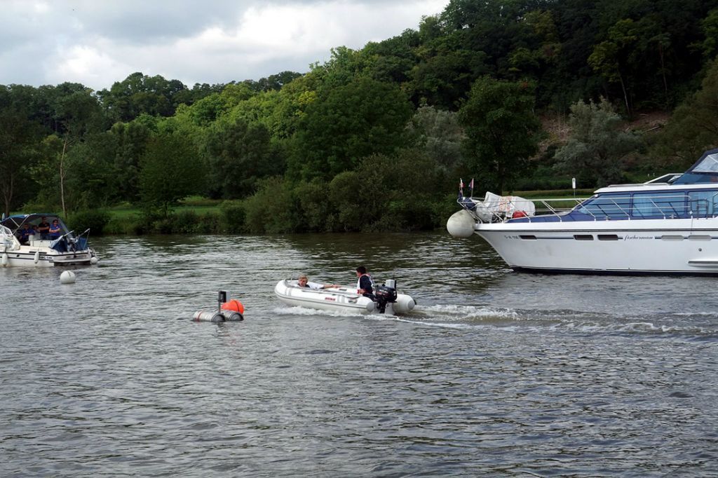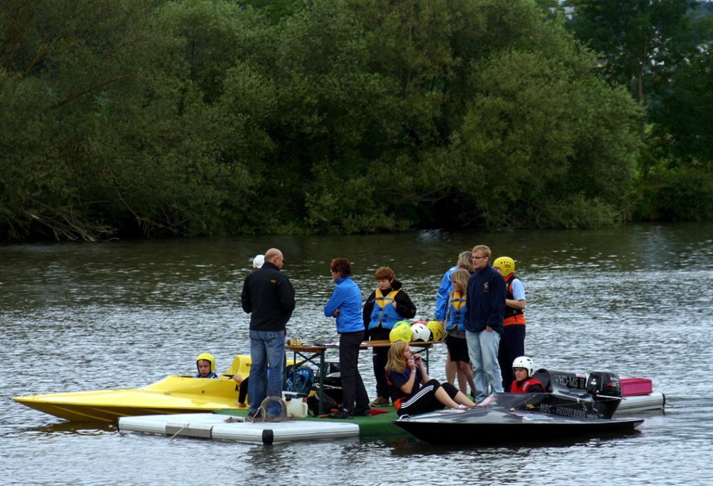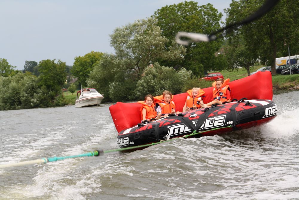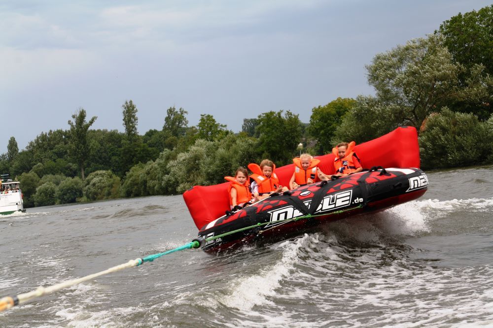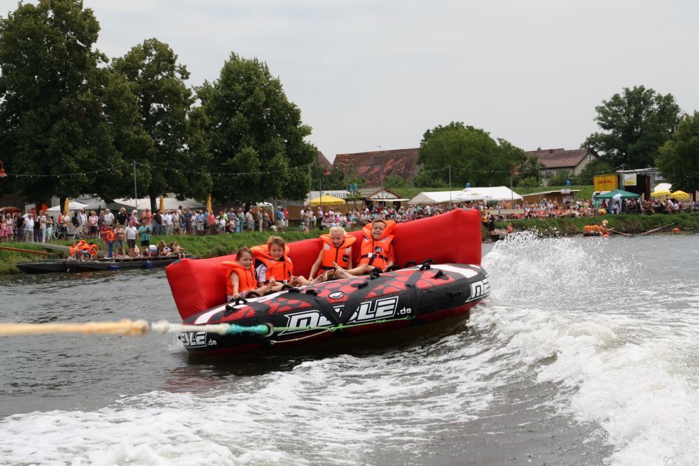 Vereinsmitglieder des Motorbootclub ziehen Sie mit einem Motorboot und einem Sofa-ähnlichen Luftkissen über den Neckar. Die Fahrgäste haben das Gefühl über dem Wasser zu schweben. Spaß und Urlaubsfeeling pur ist garantiert.